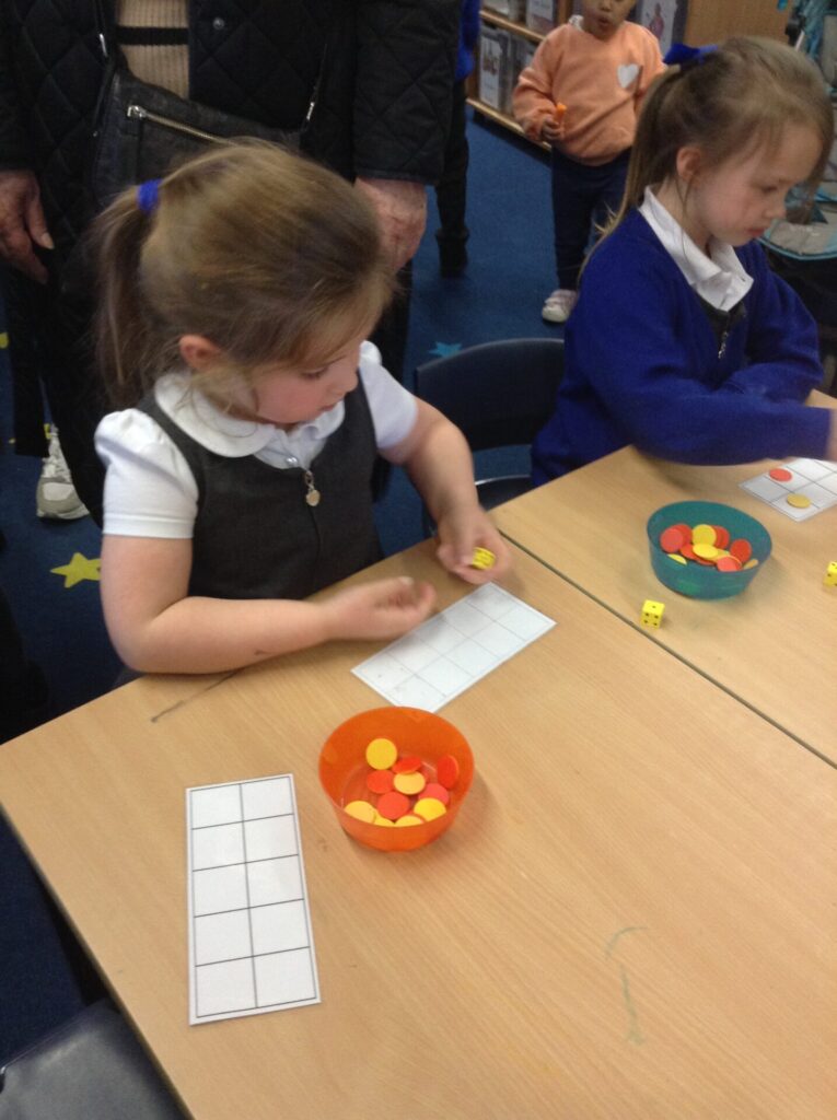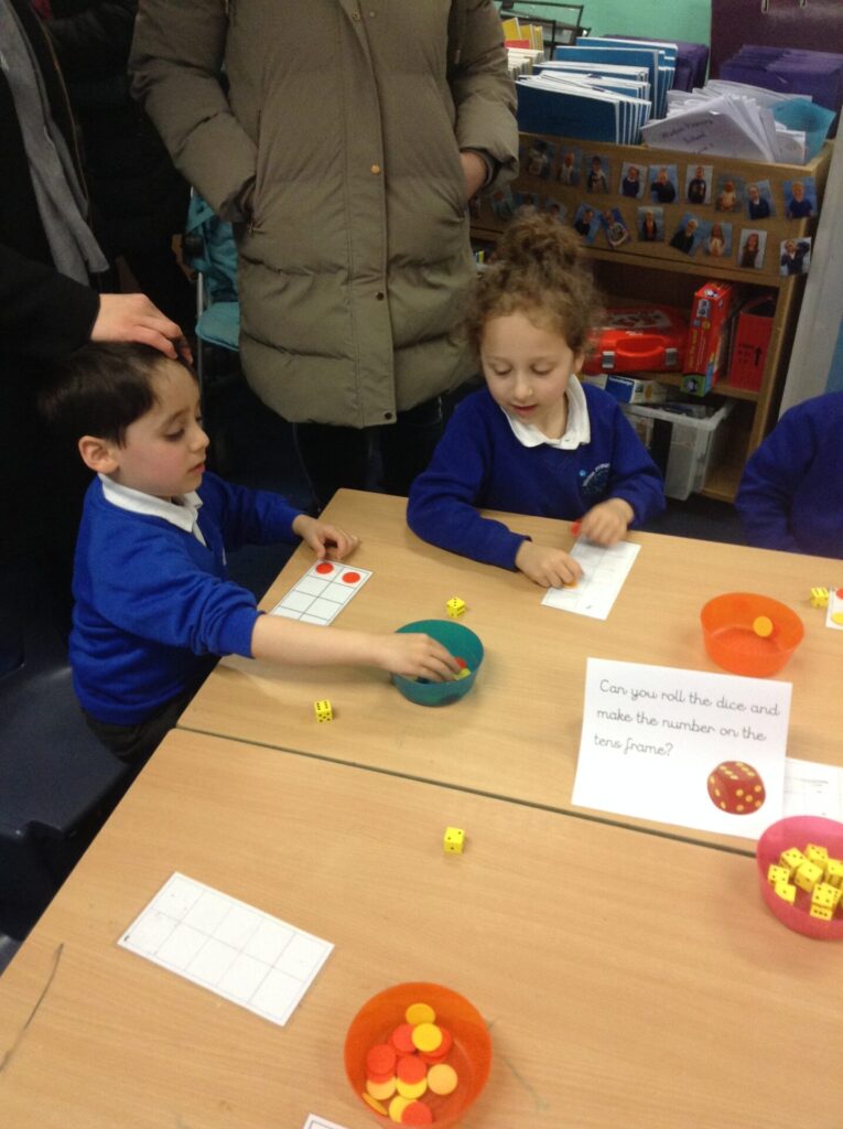 We used some dice to make addition on a tens frame. We had to use the counters to find the amounts and then place them on a tens frame and count all to find the answers.