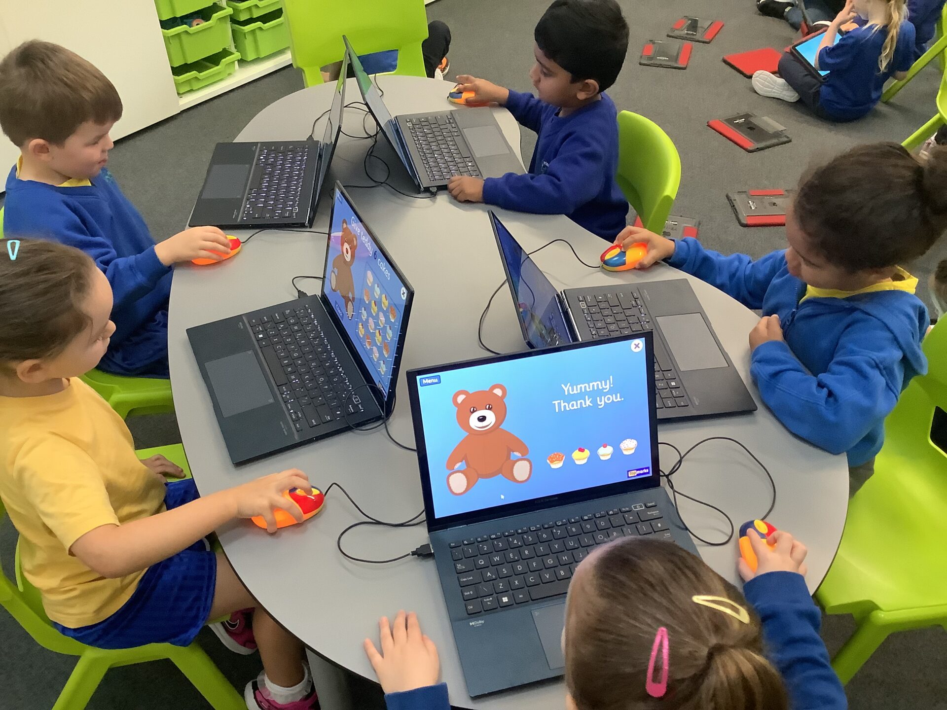 Children in Pear and Apple classes have been learning computing skills this half term. The main emphasis has been to learn how to accurately control a mouse. The children have played a number of games, starting with simple movement and clicking and moving on to ‘dragging and dropping. In today’s lesson, they had to feed teddy the correct number of cakes by dragging them onto him.