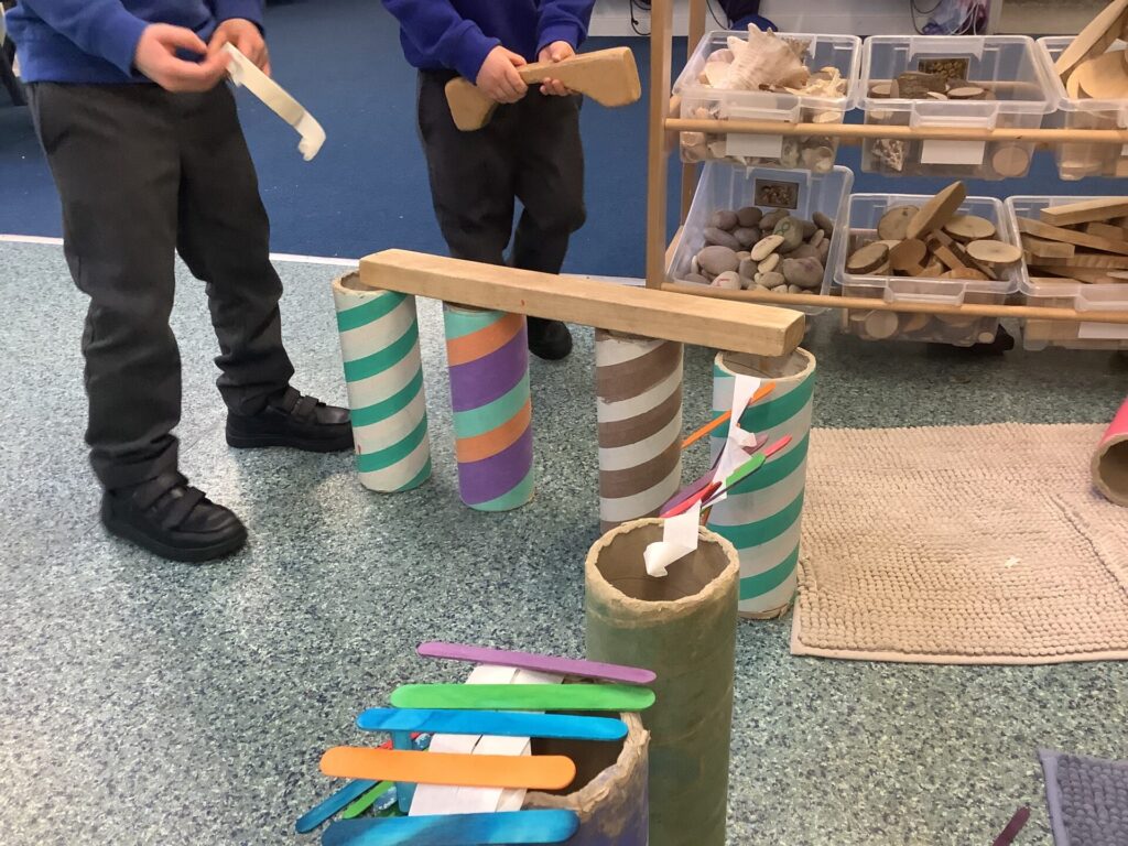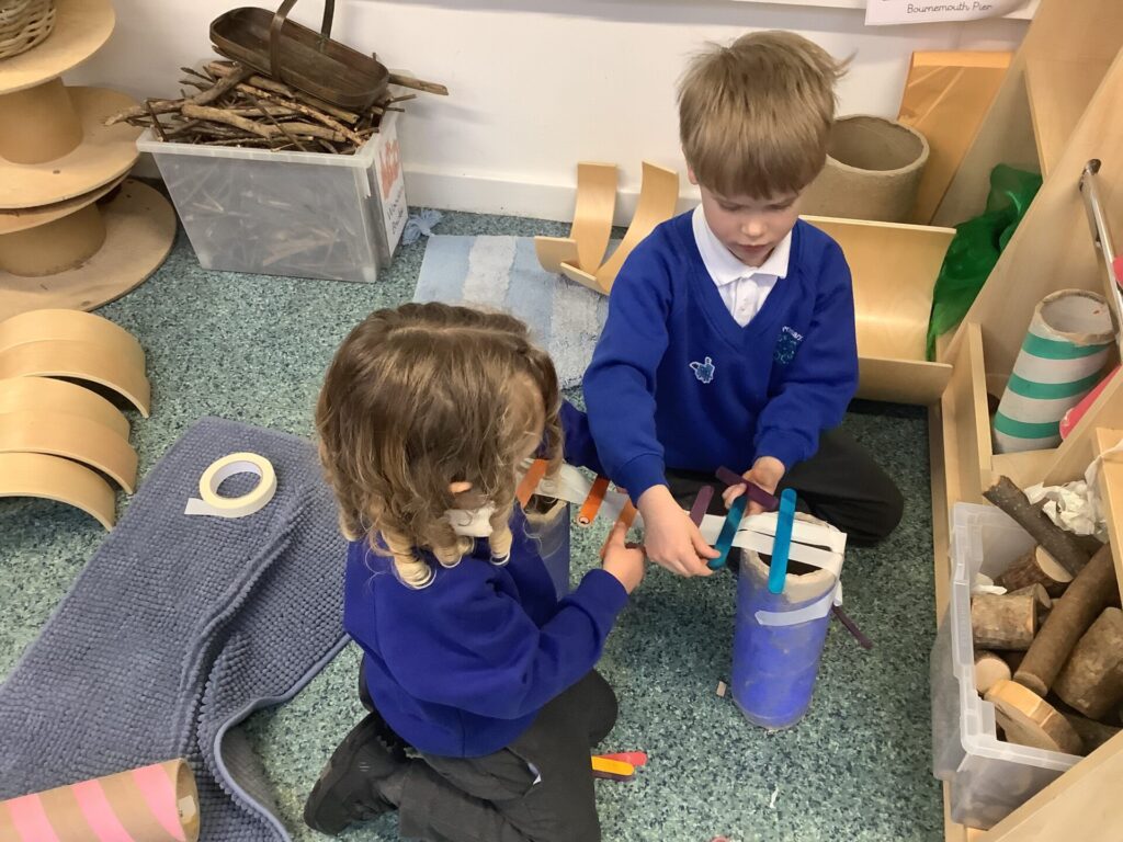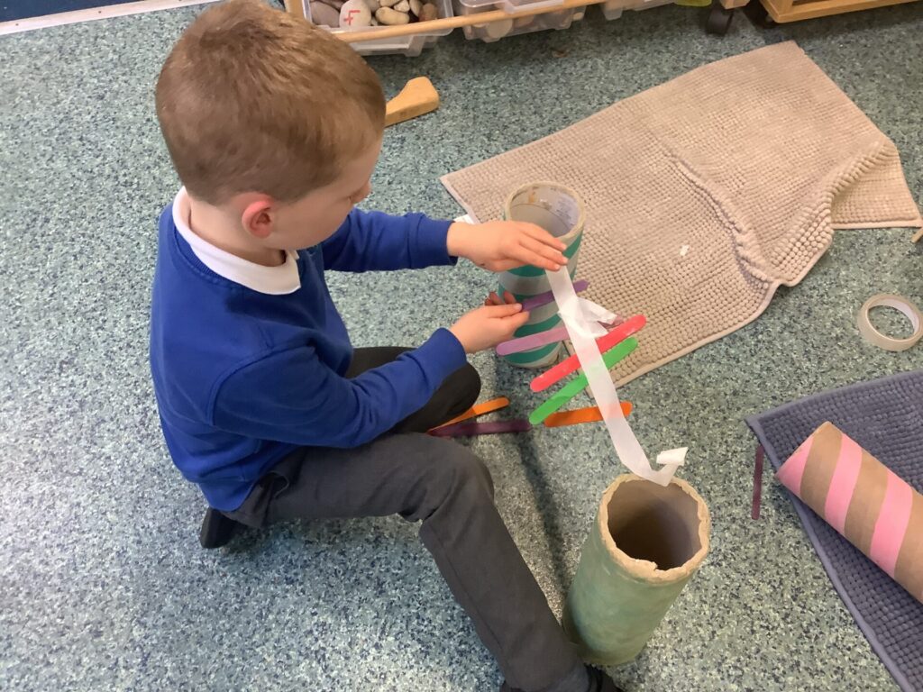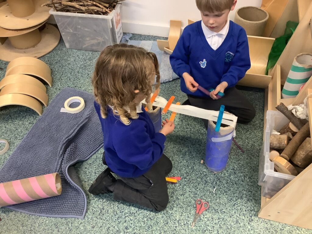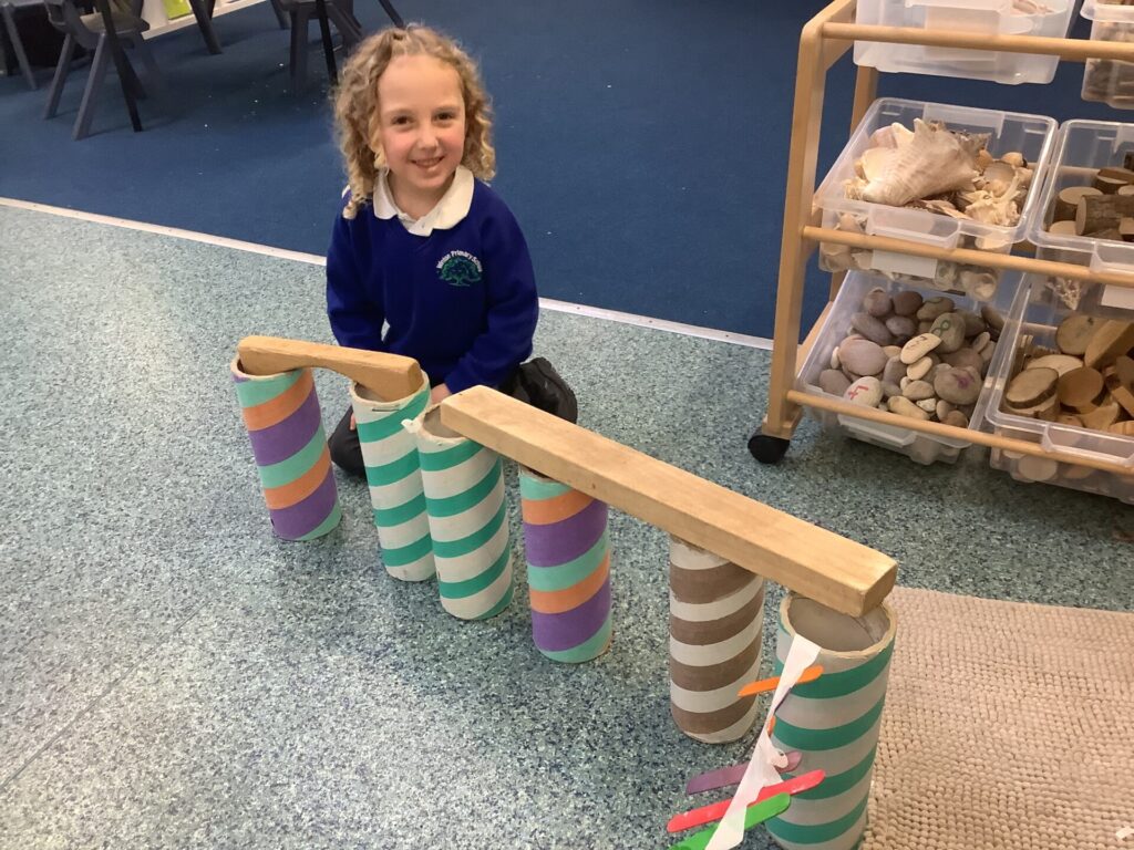 Indoor learning also has a large Block Play area. Each week there is a new challenge for the children to build with. This week they have lolly sticks, cups and masking tape as the enhancement. The challenge is to build a bridge.